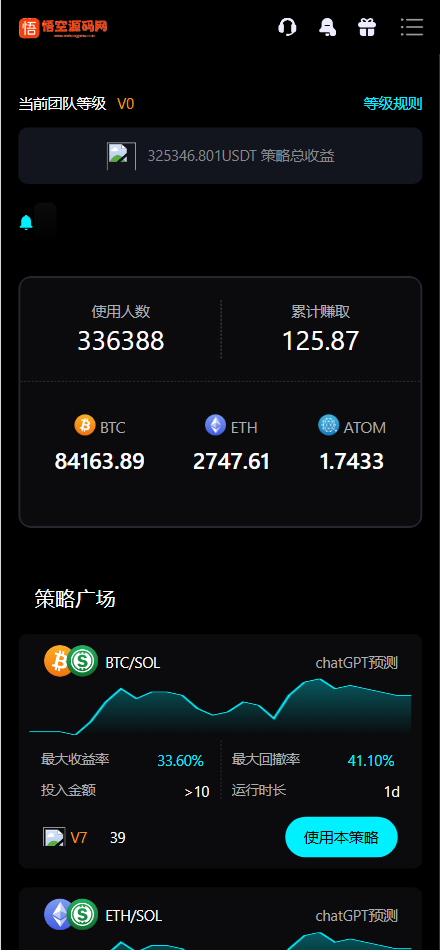 AI量化:策略广场(网格/马丁/ChatGPT预测)、自动交易、收益统计