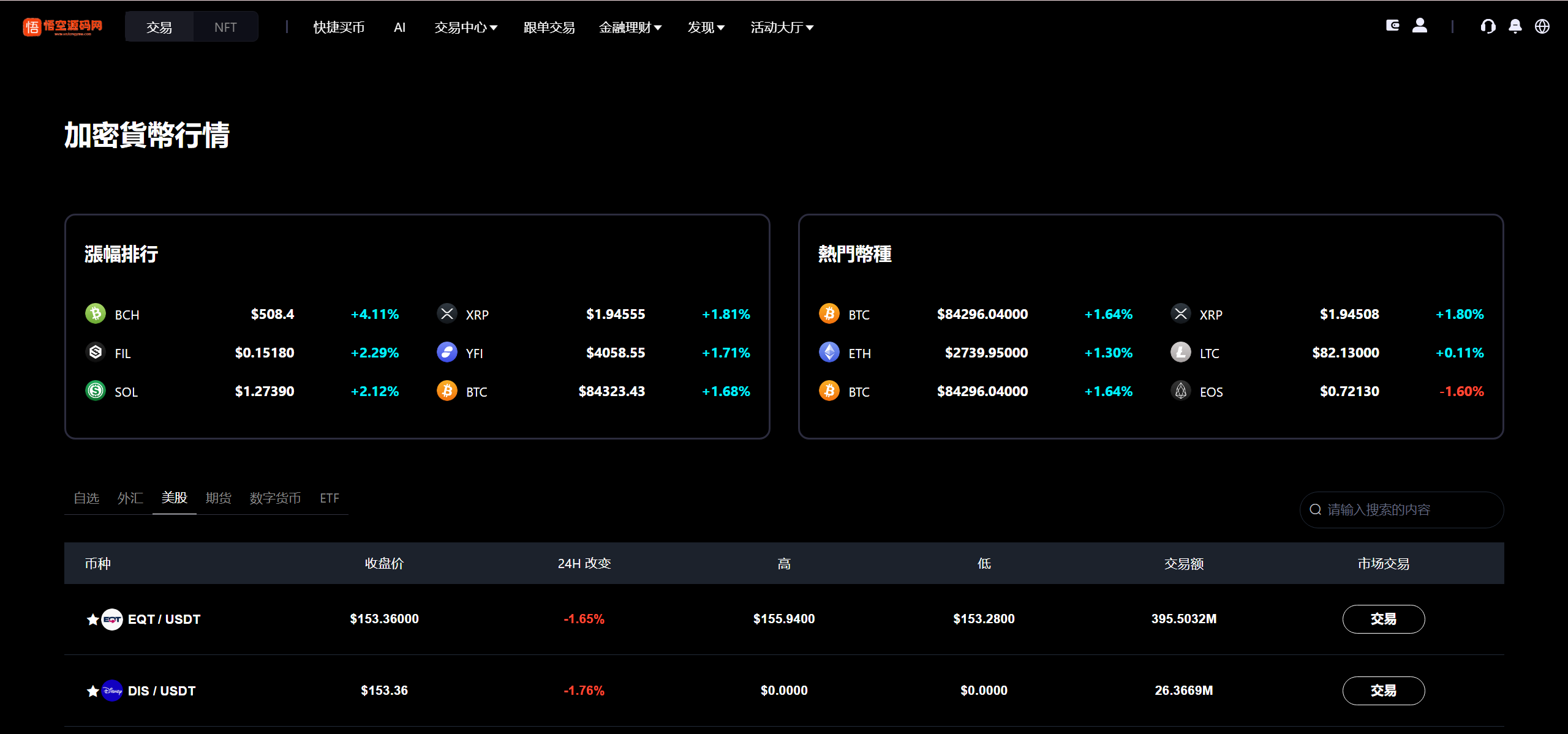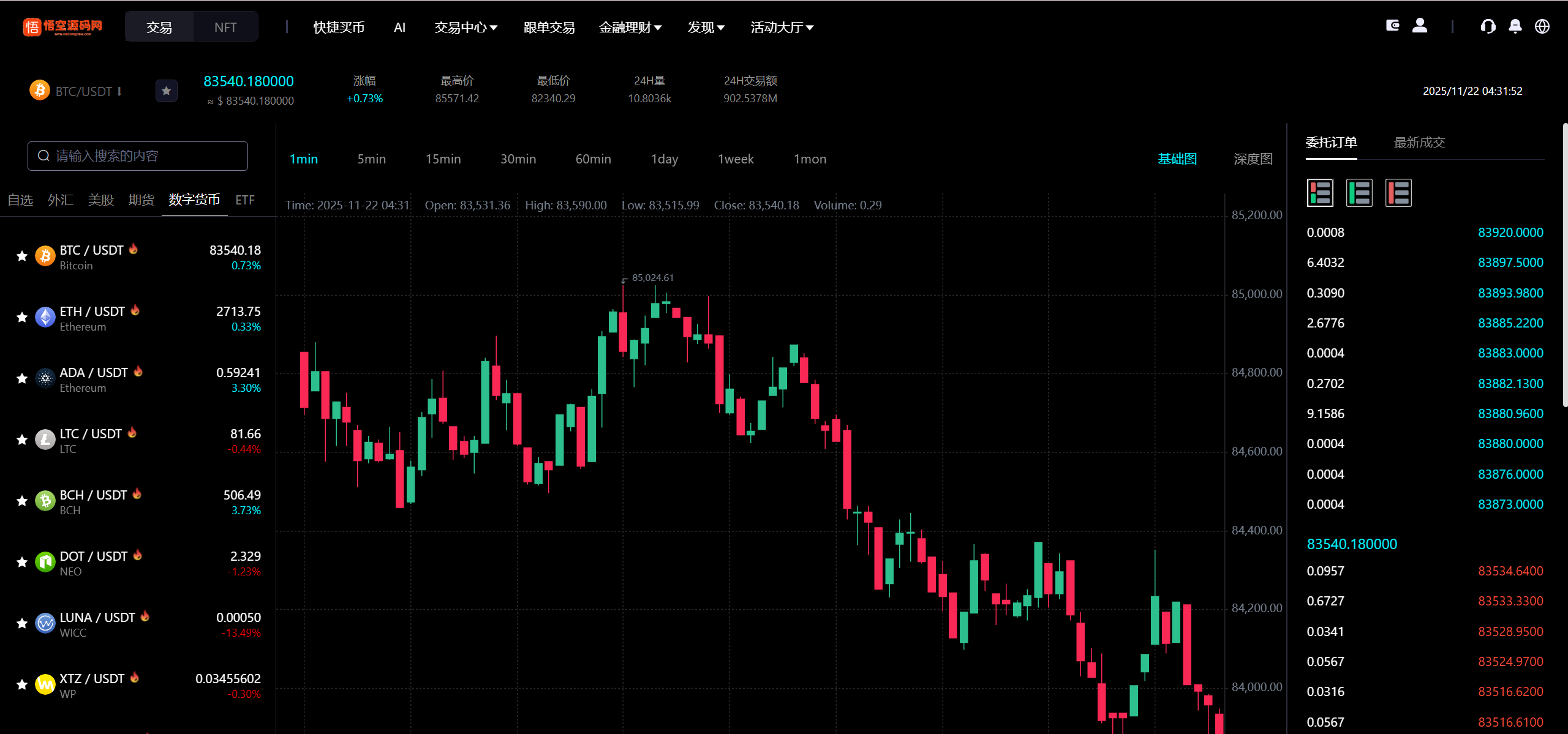 现货交易:币币交易、限价/市价下单、K线图表、委托管理