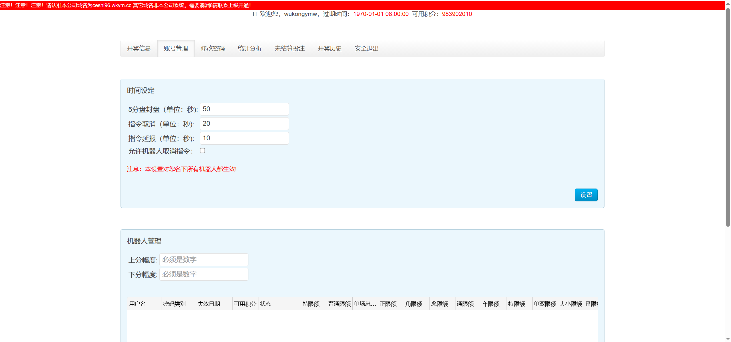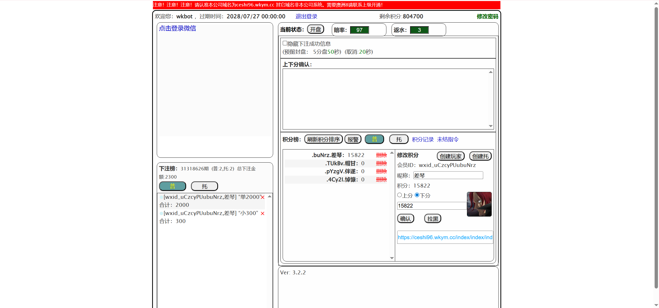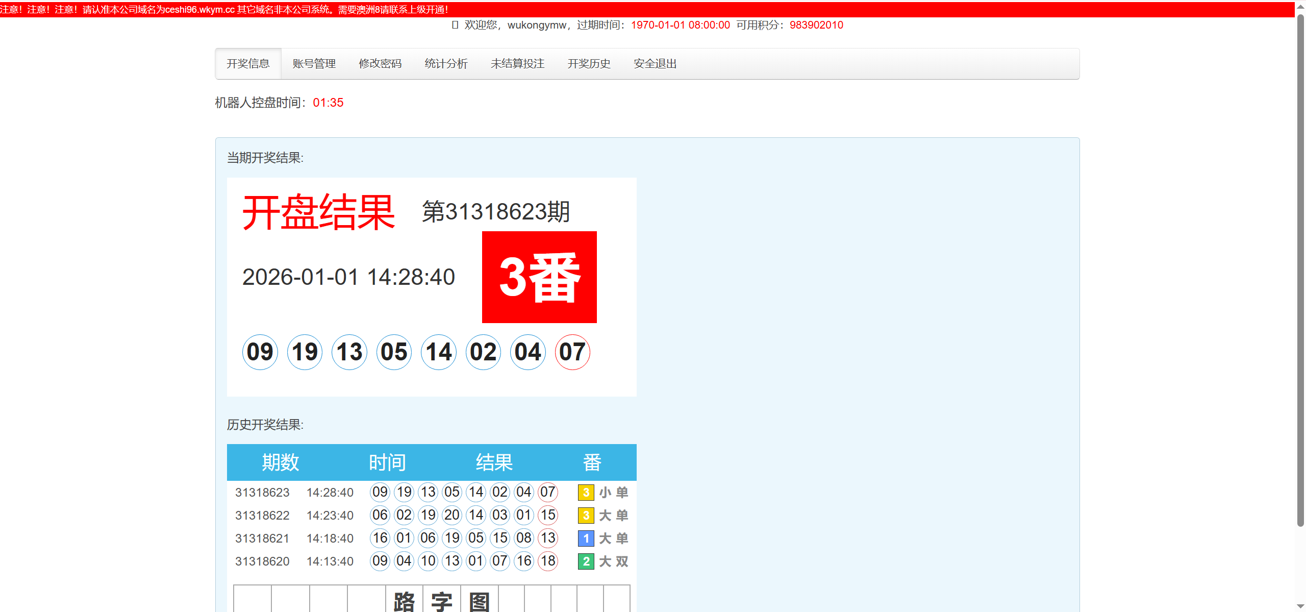 开奖对接的是168,可以正常采集开奖结算,测试除了功能单一其他也还行,总后台没有开下级代理账户的地方,前端需要在机器人后台创建玩家后复制对应链接才可以进入