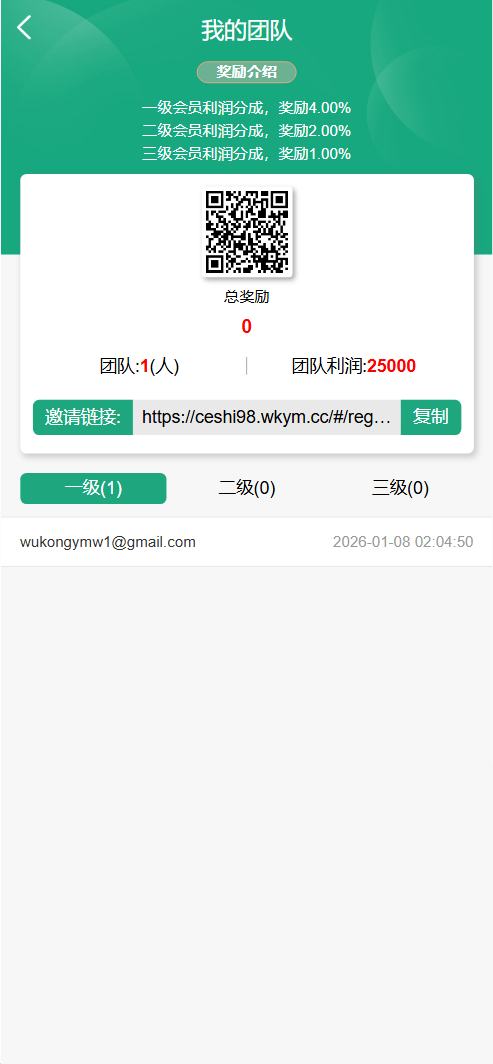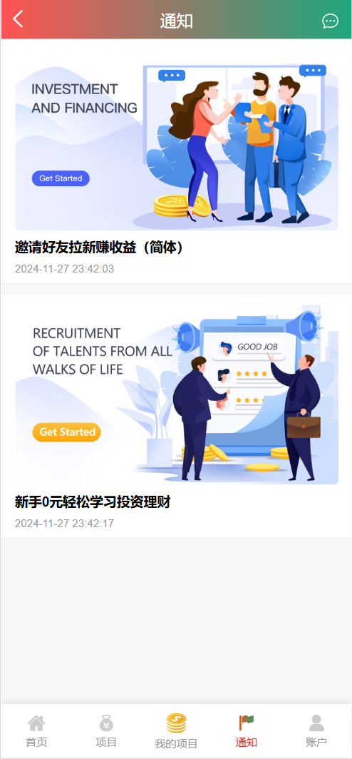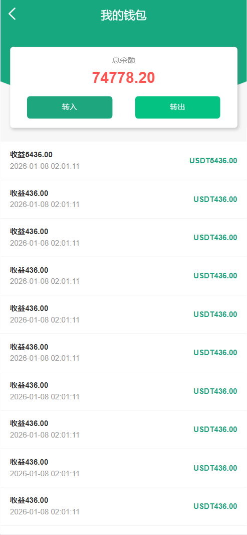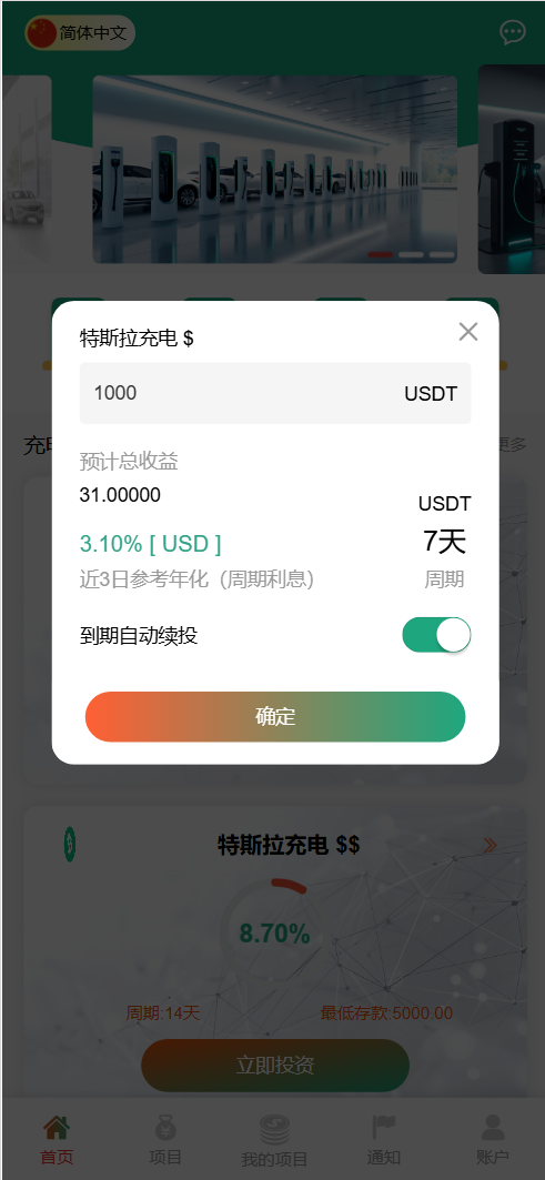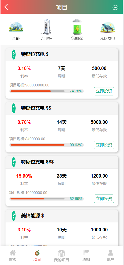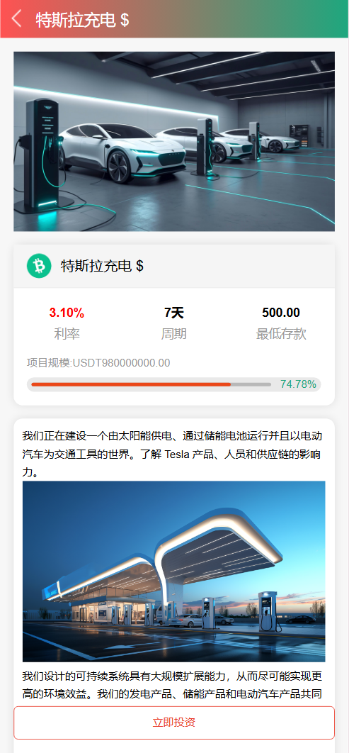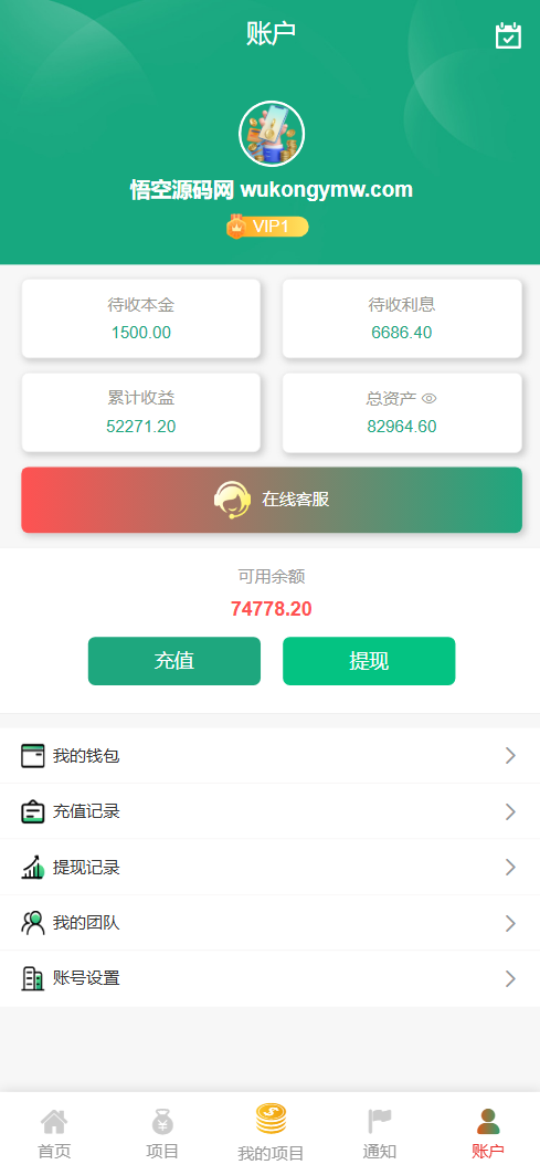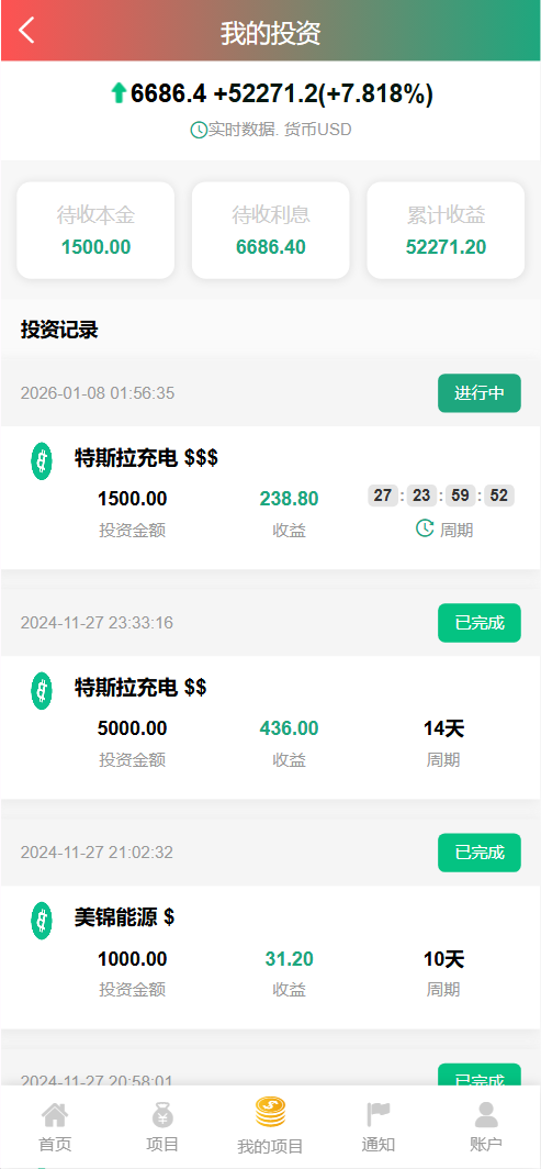 每日返息,后台可以看到投资项目的返息计划,前端充值提现有虚拟货币、银行卡等方式,后台还有代理专属推广链接功能