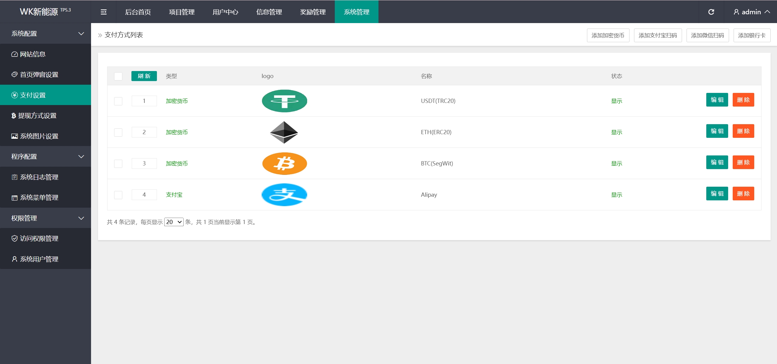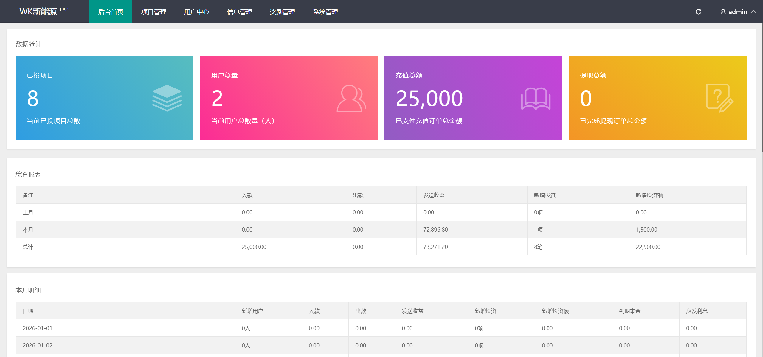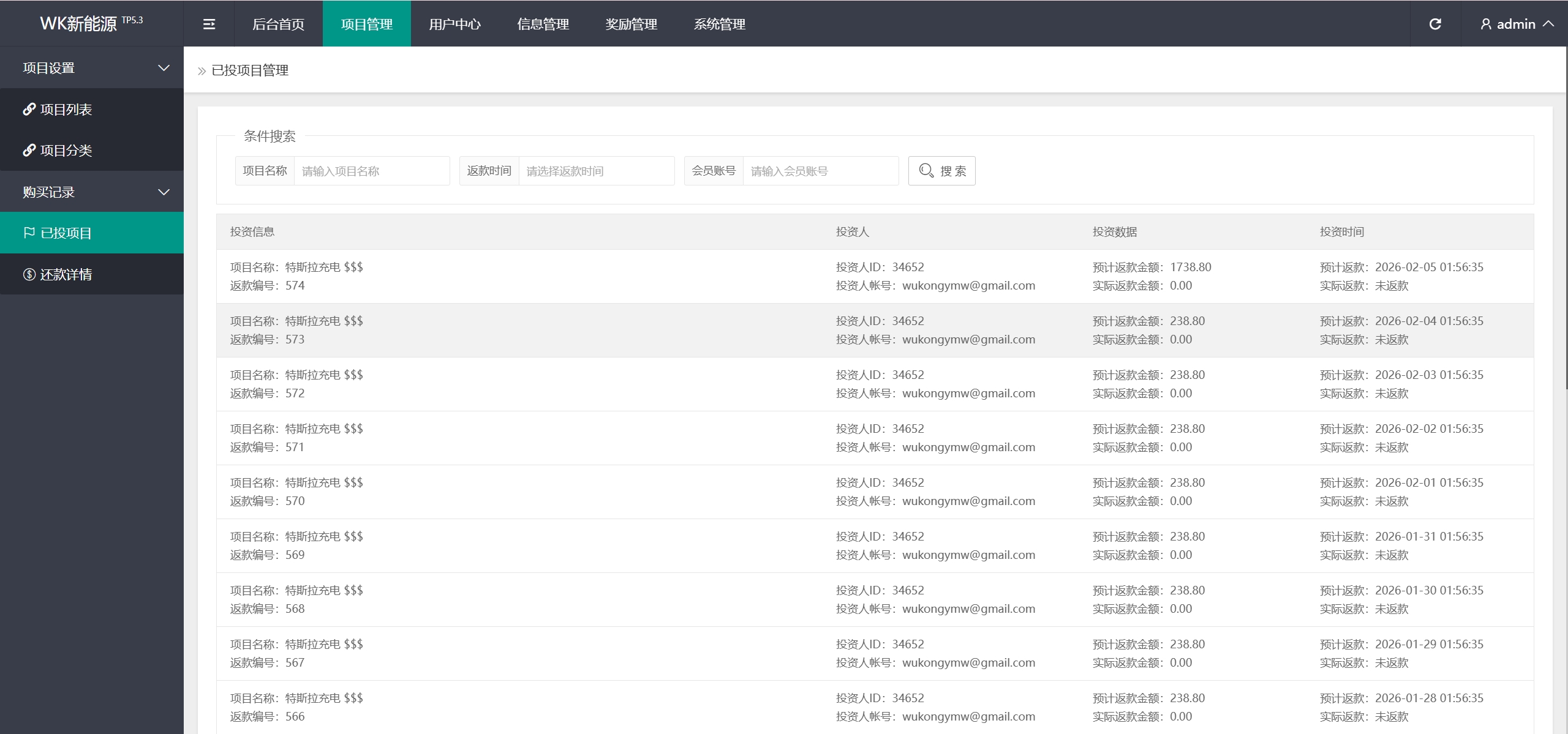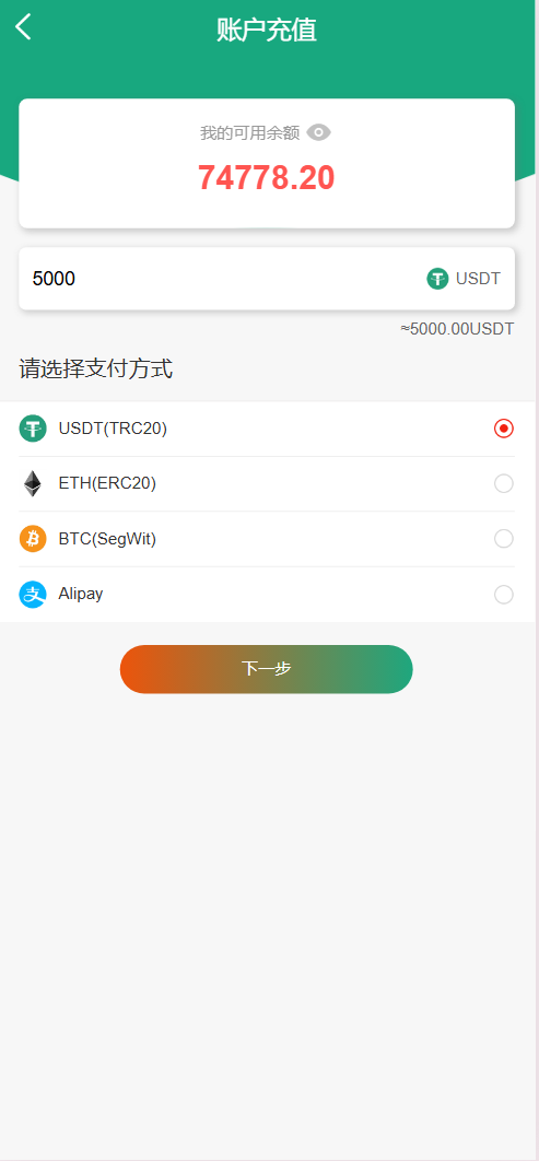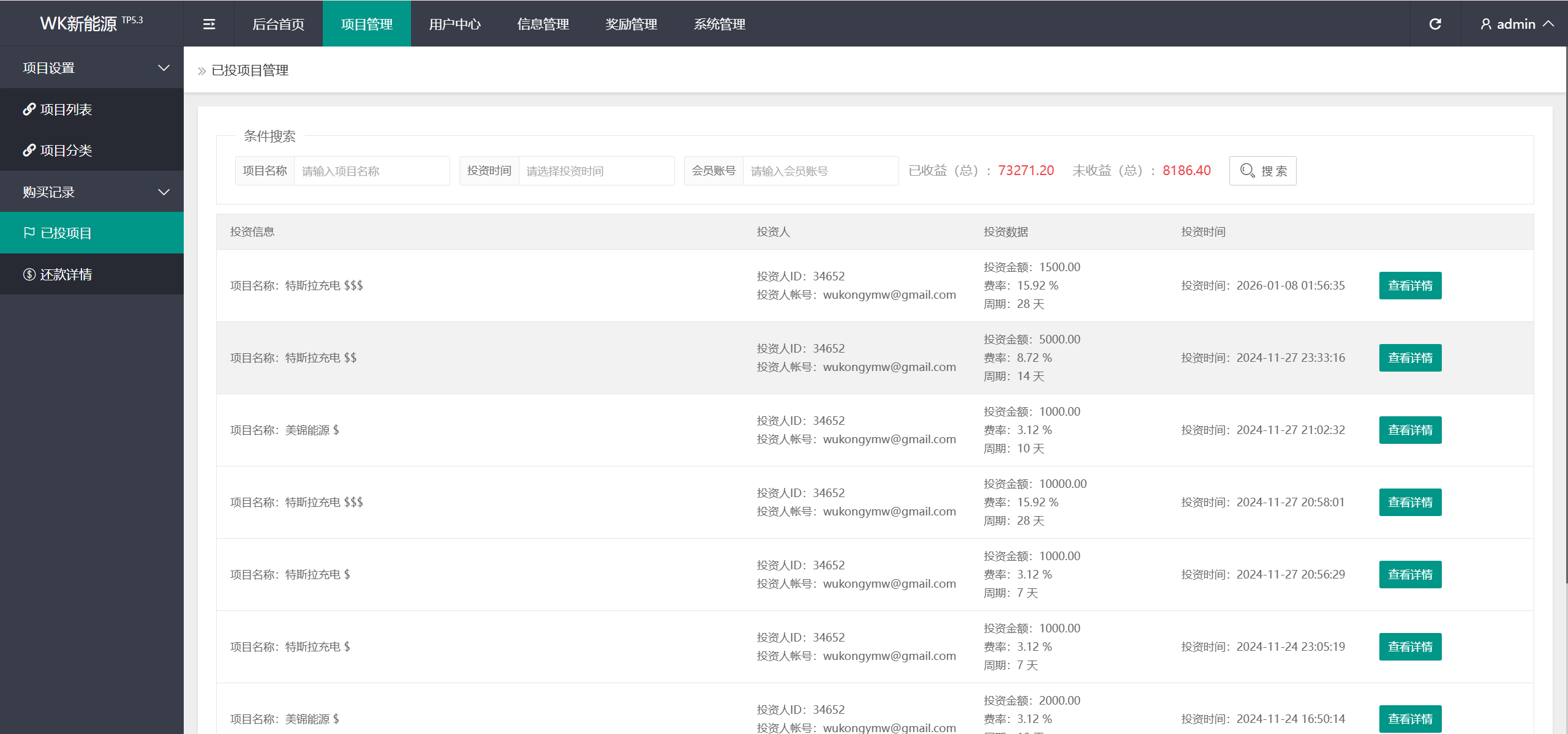 每日返息,后台可以看到投资项目的返息计划,前端充值提现有虚拟货币、银行卡等方式,后台还有代理专属推广链接功能