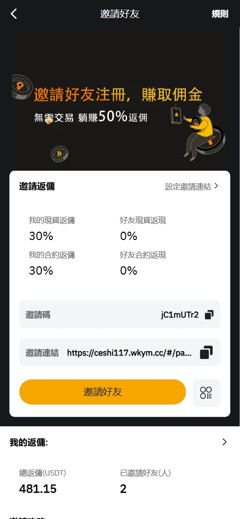 用户可以自己设置邀请返佣参数比例,代理后台的账号密码就是前端的,需要你是代理才可以登录代理后台