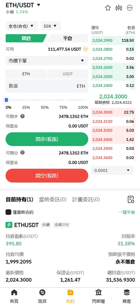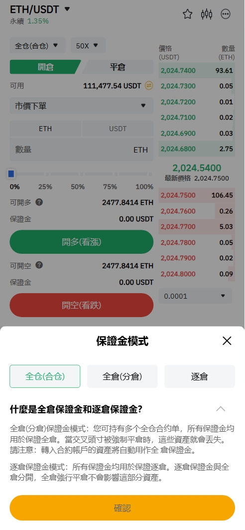 全仓保证金模式:所有保证金均用于保证全仓。当交叉头寸被强制平仓时,这些资产就会丢失。请注意:转入合约账户的资产将自动用作全仓保证金。