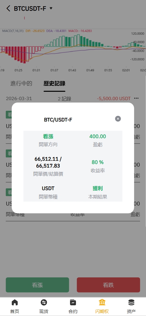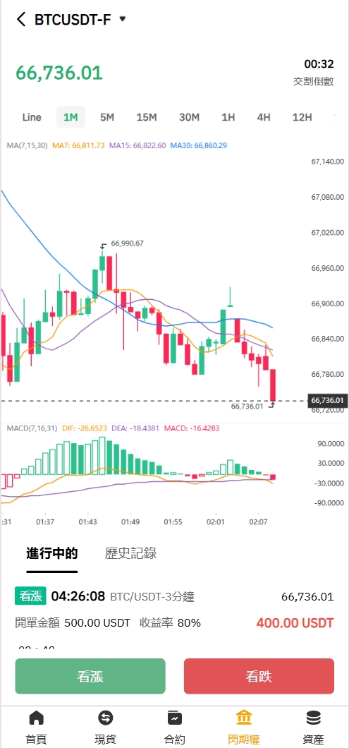 闪期权交割合约和秒合约差不多,可以选择时间和比例进行交易
