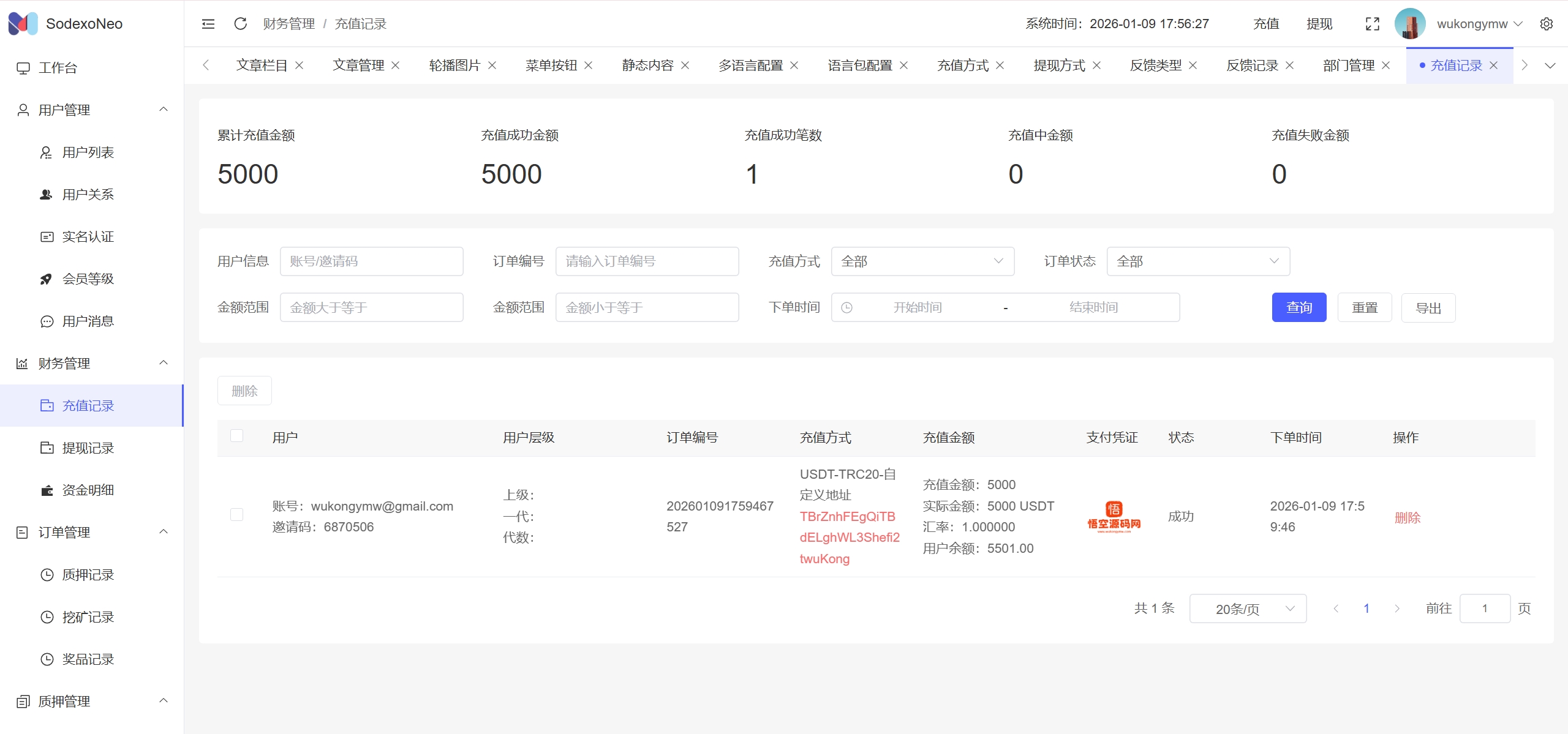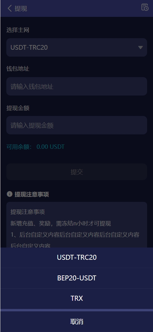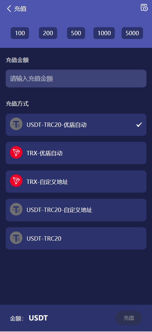 充值功能:USDT手动转账、USDT自定义地址、USDT自动充值(对接U盾钱包)