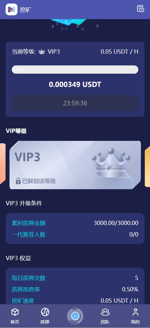 3、VIP等级划分,升级条件: 用户有效金额、1代推荐人数、推荐人等级