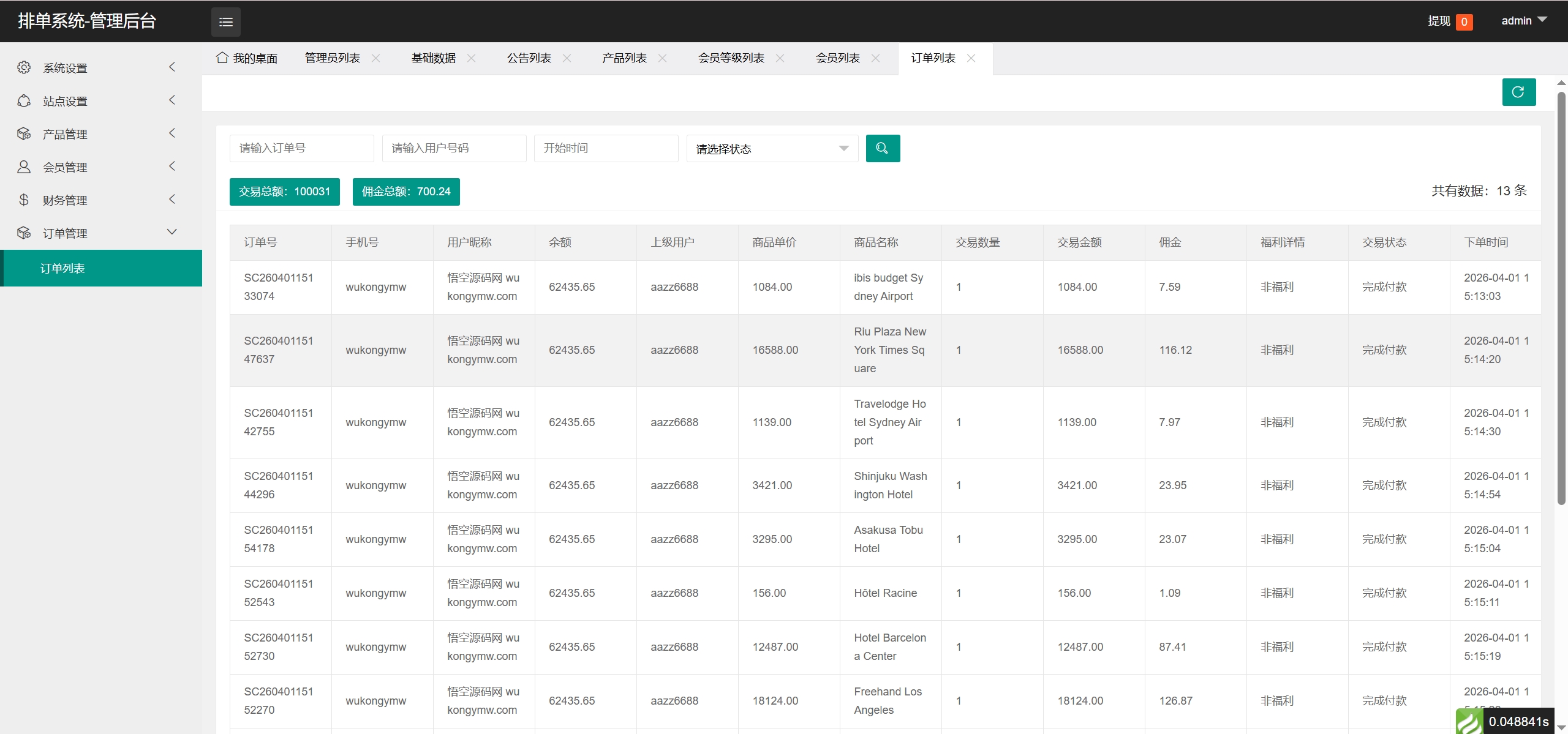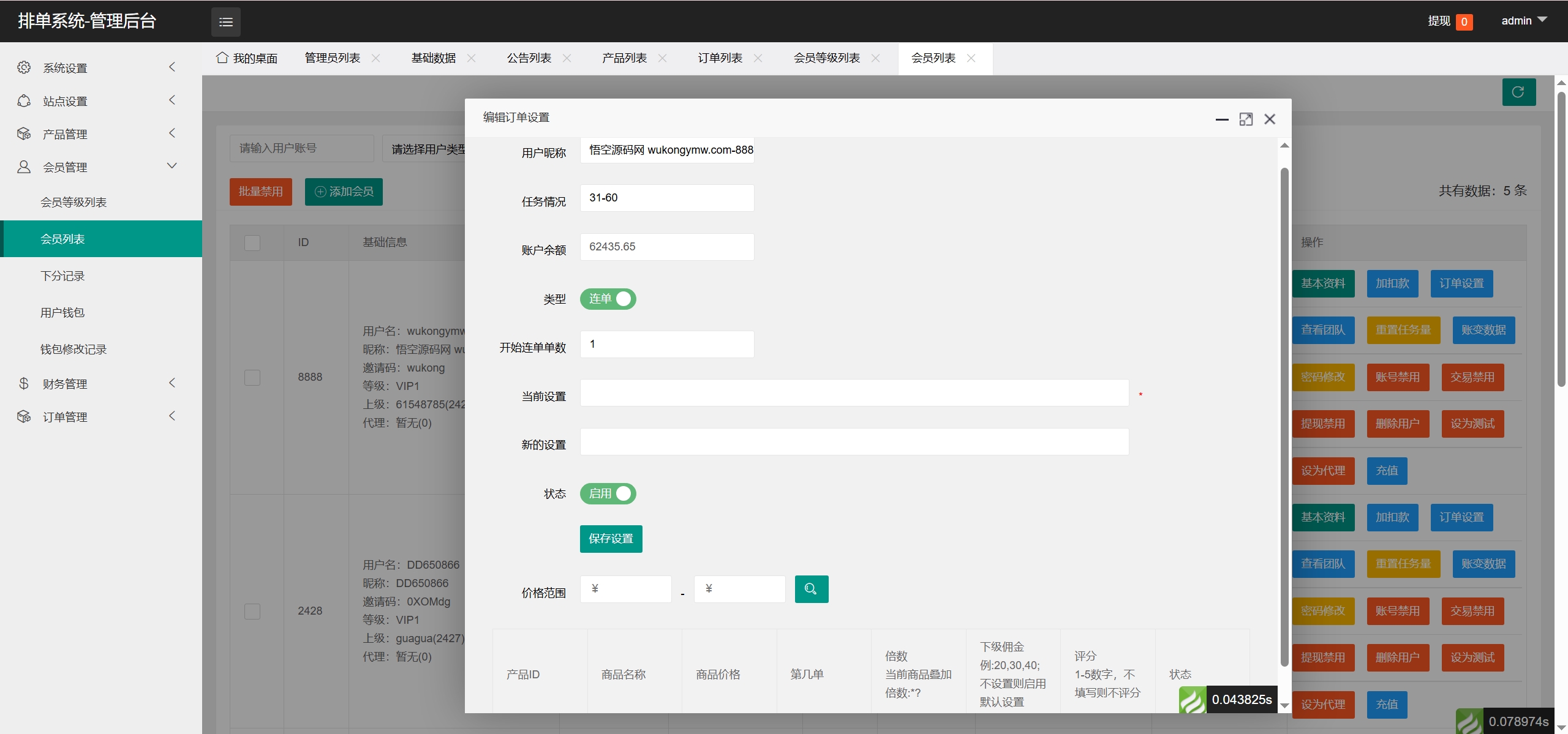 后台还是老框架,可以给会员设置卡单连单(打针),没有叠加组,后台有5级分销设置